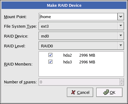 If you are making a RAID partition of /boot, you must choose RAID level 1, and it must use one of the first two drives (IDE first, SCSI second). If you are not creating a RAID partition of /boot, and you are making a RAID partition of /, it must be RAID level 1 and it must use one of the first two drives (IDE first, SCSI second).