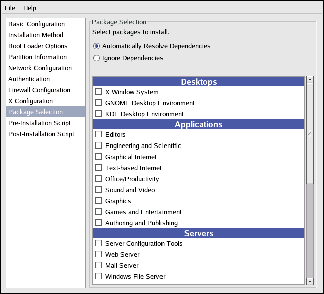 Currently, Kickstart Configurator does not allow you to select individual packages. To install individual packages, modify the %packages section of the kickstart file after you save it. Refer to Section 9.5 Package Selection for details.