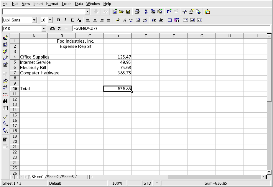 OpenOffice.org Calc allows you to enter and manipulate personal or business data. For example, you can create a personal budget by entering data descriptions (such as rent, groceries, and utilities) into column A and the quantities of those data descriptions in column B. OpenOffice.org Calc allows you to enter the data either in the cell itself by double clicking the cell and typing your information or by using the Input Line (the text box on the toolbar). Then you can run a formula on column B to come up with a total. OpenOffice.org Calc has several preset functions and calculations (such as =SUM() for addition/multiplication, =quotient() for division, and =subtotal()for preparing receipts). For detailed information about creating functions for calculating your numerical data in OpenOffice.org Calc, refer to the documentation by selecting Help => Contents.
