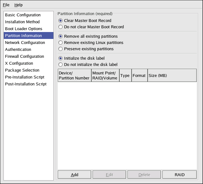 Select whether or not to clear the Master Boot Record (MBR). Choose to remove all existing partitions, remove all existing Linux partitions, or preserve existing partitions.