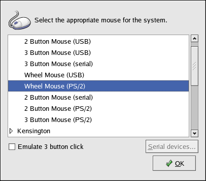 If a serial port mouse is selected, click the Serial devices button to configure the correct serial device number, such as /dev/ttyS0 for the mouse.