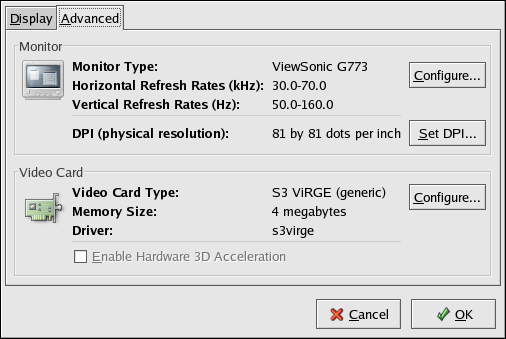 To change the monitor type or any of its settings, click the corresponding Configure button. To change the video card type or any of its settings, click the Configure button beside its settings.