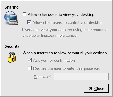 These different levels of access are configurable through Applications (the main menu on the panel) => Preferences => Remote Desktop menu item.