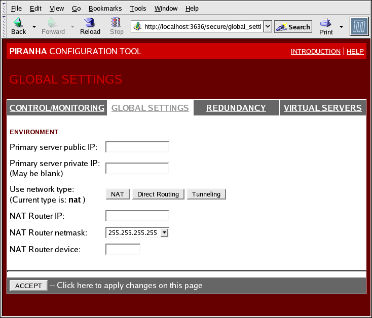 The GLOBAL SETTINGS panel is where the cluster administrator defines the networking details for the primary LVS router's public and private network interfaces.