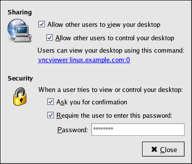 These different levels of access are configurable through Applications (the main menu on the panel) => Preferences => Remote Desktop menu item.