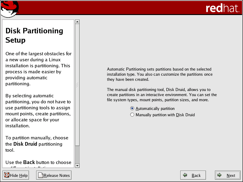 On this screen, you can choose to perform automatic partitioning, or manual partitioning using Disk Druid.