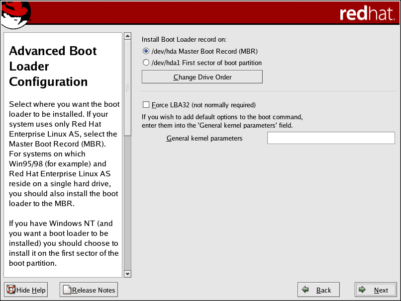 The Force LBA32 (not normally required) option allows you to exceed the 1024 cylinder limit for the /boot/ partition. If you have a system which supports the LBA32 extension for booting operating systems above the 1024 cylinder limit, and you want to place your /boot/ partition above cylinder 1024, you should select this option.