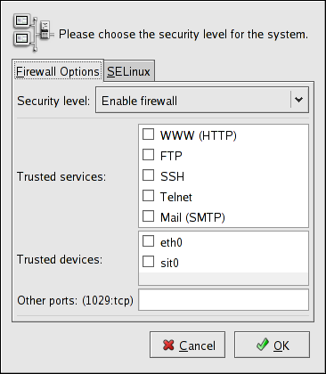 The options selected are also written to the /etc/sysconfig/system-config-securitylevel file so that the settings can be restored the next time the application is started. Do not edit this file by hand.