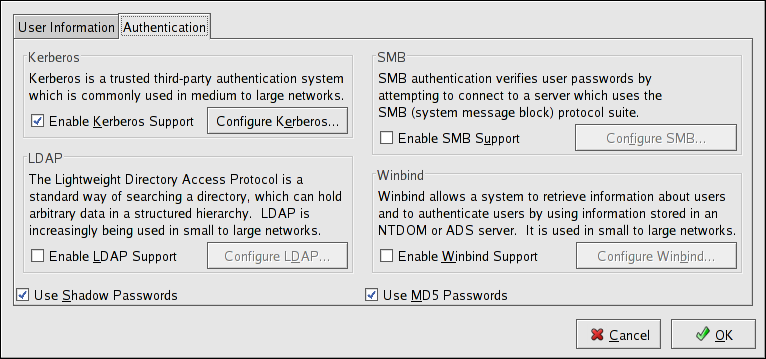 The Authentication tab allows for the configuration of network authentication methods. To enable an option, click the empty checkbox beside it. To disable an option, click the checkbox beside it to clear the checkbox.