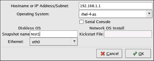 After completing the steps in Section 4.4 Finish Configuring the Diskless Environment, a window appears to allow hosts to be added for the diskless environment. Click the New button. In the dialog shown in Figure 4-1, provide the following information: