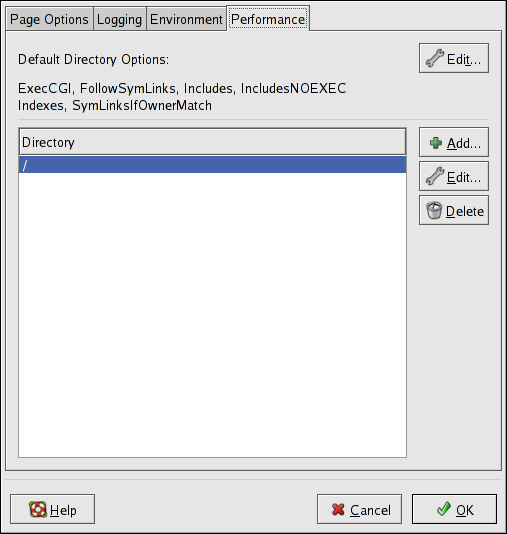 Use the Directories page in the Performance tab to configure options for specific directories. This corresponds to the <Directory> directive.
