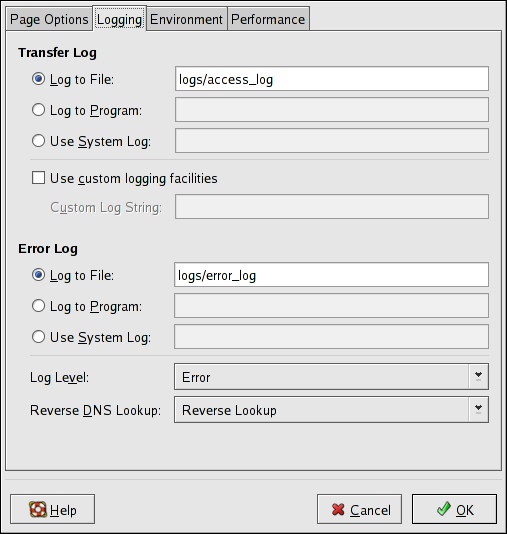 The error log contains a list of any server errors that occur. Enter the name of the path and file in which to store this information. If the path and file name do not start with a slash (/), the path is relative to the server root directory as configured. This option corresponds to the ErrorLog directive.