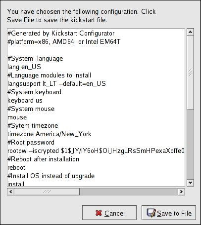 To save the kickstart file, click the Save to File button in the preview window. To save the file without previewing it, select File => Save File or press [Ctrl]-[S]. A dialog box appears. Select where to save the file.