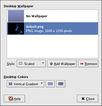 To create a background with your own custom colors and no images, choose the No Wallpaper option and adjust your colors below Desktop Colors. You can choose either a solid color or a gradient of two colors. Clicking on the color buttons allows you to change the colors. Click Close to save and exit the Background Preferences tool.