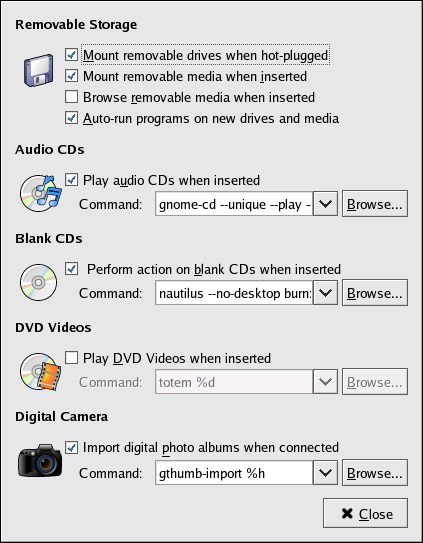 Launch the Removable Storage tool from the Applications => Preferences sub-menu. The application opens a list of options for the way your system handles removable storage media such as floppy diskettes and CD-ROMs. One default option is auto-mounting. Auto-mount means that the data on your removable media is automatically available a few moments after you insert it; manual mounting is not necessary. For more information on removable media, refer to Chapter 13 Diskettes and CD-ROMs or the Red Hat Enterprise Linux System Administration Guide.