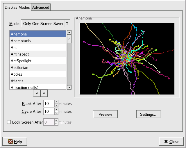 Double-click the Screensaver icon to launch the Screensaver Preferences tool. The list on the left displays the available screensavers. Nearly all screensavers can be customized by clicking on the Settings... button. To see if this is the screensaver you would like to use, click on the Preview button. When you have seen enough, click the mouse anywhere on the screen and you will return to Screensaver Preferences. When you are finished, close the window to save your changes and exit.