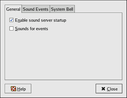 The Sound preference tool allows you to set sounds to accompany events. For example, your system can play a certain sound every time you login. When you first open this tool, you should see a series of tabs across the top of the window. Under the General tab, check that the Enable sound server startup box is checked.