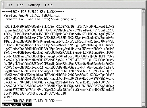 Now, the file mykey.asc can be inserted into email or exported to a keyserver. To see the key, type less mykey.asc to open the file in a pager (type [q] to quit the pager). It should look like the following: