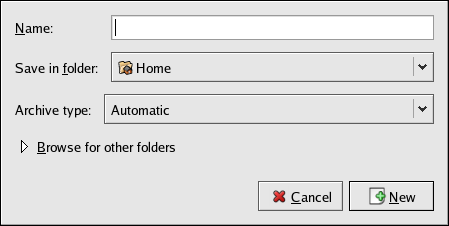 File Roller allows you to create archives of your files and directories. To create a new archive, click New on the toolbar. A file browser pops up, allowing you to specify an archive name and the compression technique. For example, you may choose a Tar Compressed with gzip (.tar.gz) format from the drop-down menu and type the name of the archive file you want to create. Click OK and your new archive is ready to be filled with files and directories. To add files to your new archive, click Add, which opens a browser window that you can navigate to find the file or directory to add to the archive. Click Add when you are finished, and click Archive => Close to close the archive.