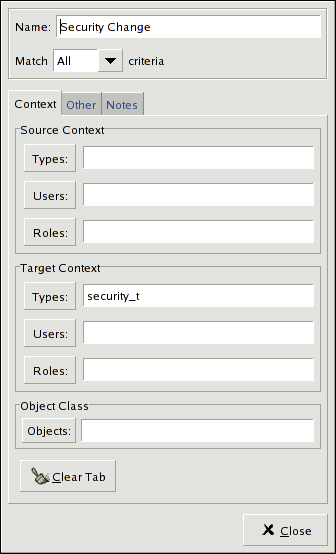 From here you can set filters to sort on source context, target context, object class, IP address, port, interface, source executable, path to the target, and hostname. Criteria matching is all or any. When you choose a context for a filter, such as under Target Type clicking on Types:, the Select Target Types window pops up with the available types, as shown in Figure 6-4. These types are just the ones that are represented in the audit logs: