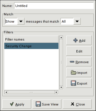 The View window is where you create filters to help organize and analyze log entries. Clicking on the Add or Edit button brings up the Edit filter window: